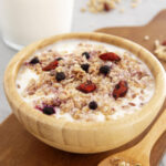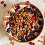 Mezcla de granola, frutos secos y semillas, ideal para acompañar yogurt o disfrutar como snack saludable.