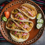 Tacos rellenos de carne de cerdo marinada en achiote, acompañados de salsa verde, guacamole, frijoles, pico de gallo, jalapeños encurtidos y crema agría.