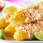 Granos de maíz tierno mezclados con queso fresco, crema y un toque de chile en polvo o limón.