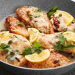 Pollo tierno bañado en una salsa cremosa con un toque especiado.